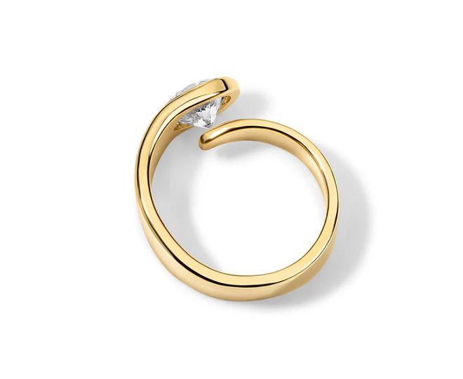 这枚黄金钻石戒指,黄金打造的戒托如同波浪般流动蜿蜒,一枚榄尖形咖钻和一枚榄尖形无色钻石镶嵌在戒指的正中,经典的双石款,款式简洁大气,呈现出一种素净温柔的现代美。