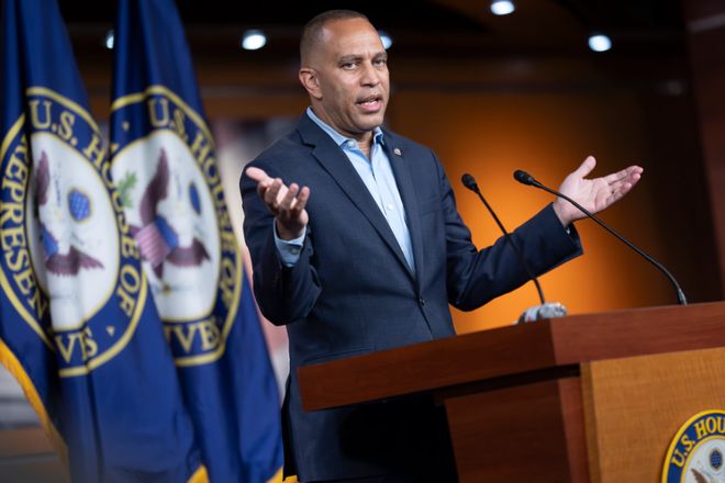 2025年7月14日,众议院少数党领袖、纽约州议员哈基姆·杰弗里斯在华盛顿国会大厦举行的新闻发布会上谈到唐纳德·特朗普总统的政策以及共和党本月通过的税收和削减开支法案。图源:
