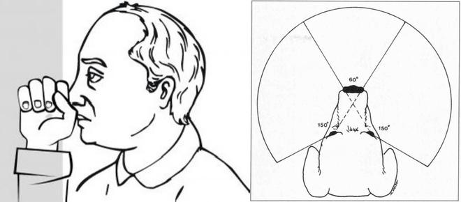 狗的口鼻挡住了它们试图看的人脸下部的视野,这是导致狗在我们和它们说话时歪头的因素之一 / 左图[3]右图(一只典型的中等头型犬的单眼视野范围和双眼视野范围)[5]